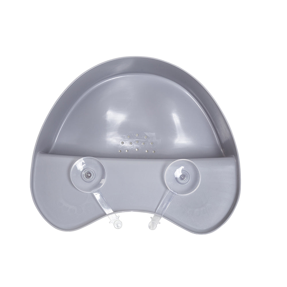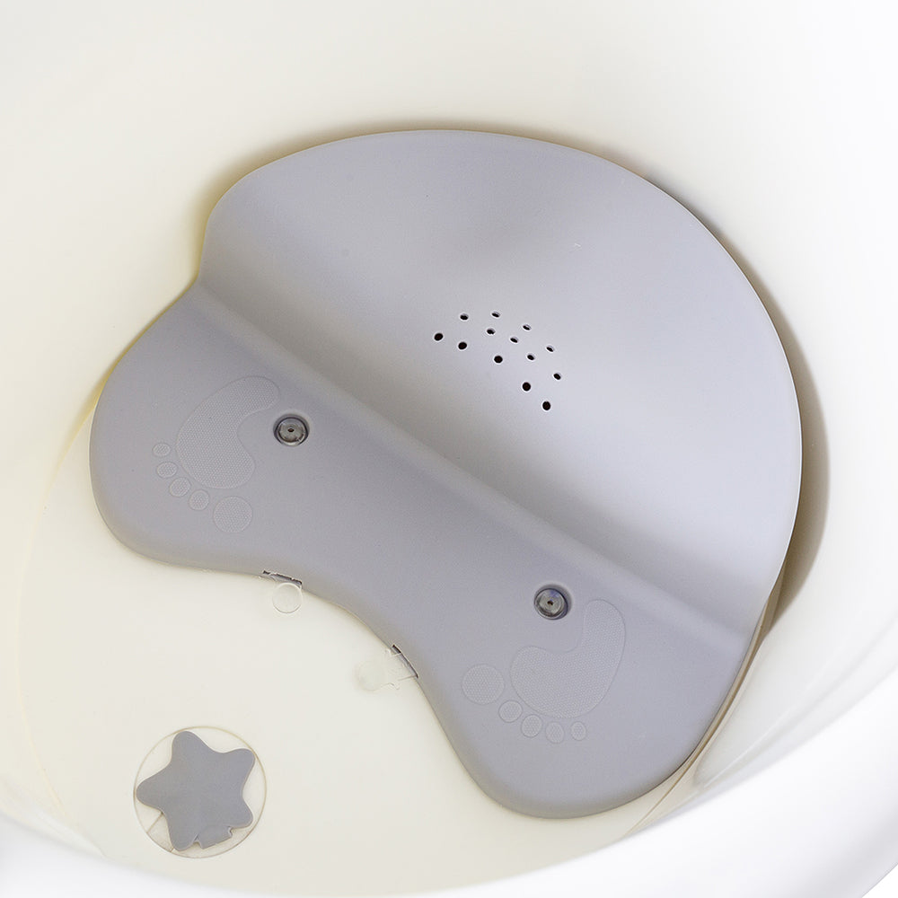 Na parte externa a base emborrachada ajuda na estabilidade, possui saboneteira removível e saída de água. Um produto prático e leve para facilitar o dia a dia dos pais.