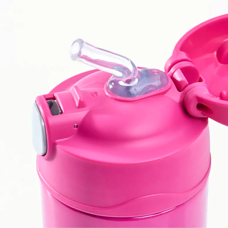 É uma garrafa térmica fácil para a criança abrir através do sistema de abertura com mão única e o canudo em silicone macio que acompanha o produto proporcionando conforto na hora de beber, além da alça de transporte integrada ao produto com design leve e compacto, perfeita para todas as ocasiões.