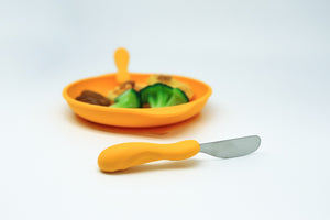 O jogo é feito em inox com cabo em silicone dando maior aderência e o formato anatômico facilita a pega. A borda da colher mesmo sendo em inox é arredondada para não machucar a boquinha dos pequenos. O garfo, também em inox e com cabo em silicone, com dentes de bordas arredondadas. A faca segue o mesmo padrão de inox e cabo em silicone, com serra somente em um dos lados para evitar que as crianças se machuquem.
