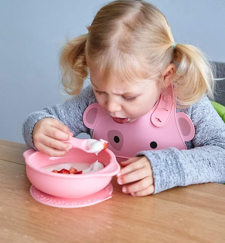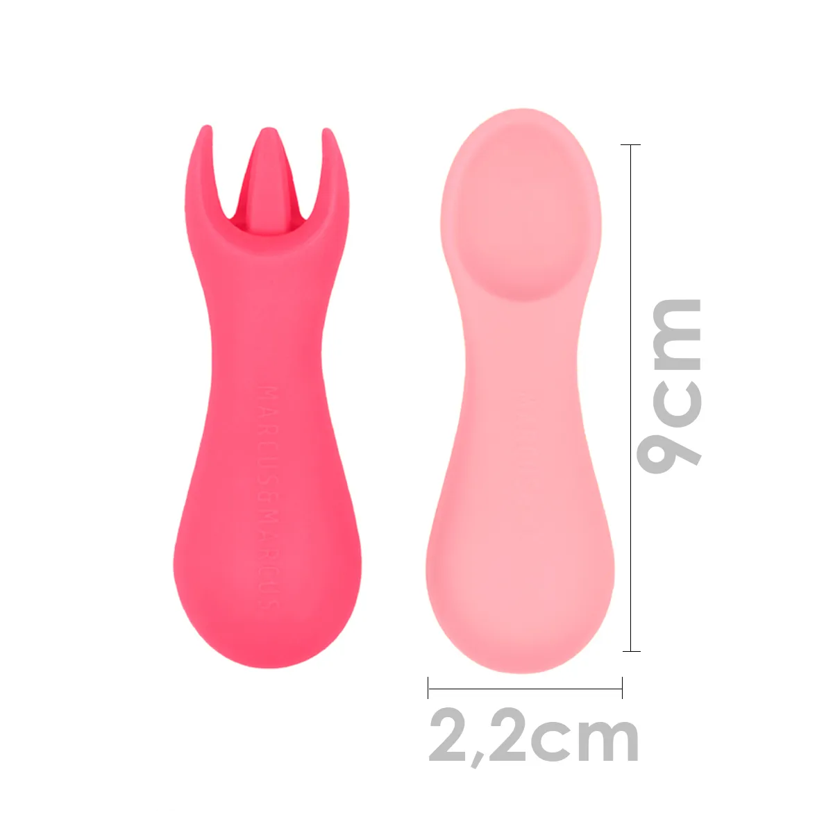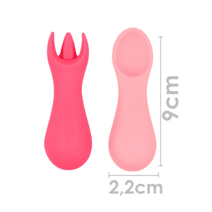 O kit de colher e garfo para treinamento é indicado para bebês ainda sem dentes. O conjunto tem destaque em design, pois a colher é de silicone, leve e pequena, com cabo anatômico, perfeita para facilitar a pega dos bebês. A borda é macia, não machuca a gengiva. O garfo, também em silicone e anatômico, tem dentes macios, mas que permitem que a criança espete um pedaço de fruta e o leve à boca sem grande dificuldade. O formato da colher e do garfo enfoca o treinamento motor, visando refinar a pega da criança.