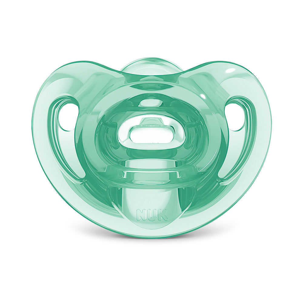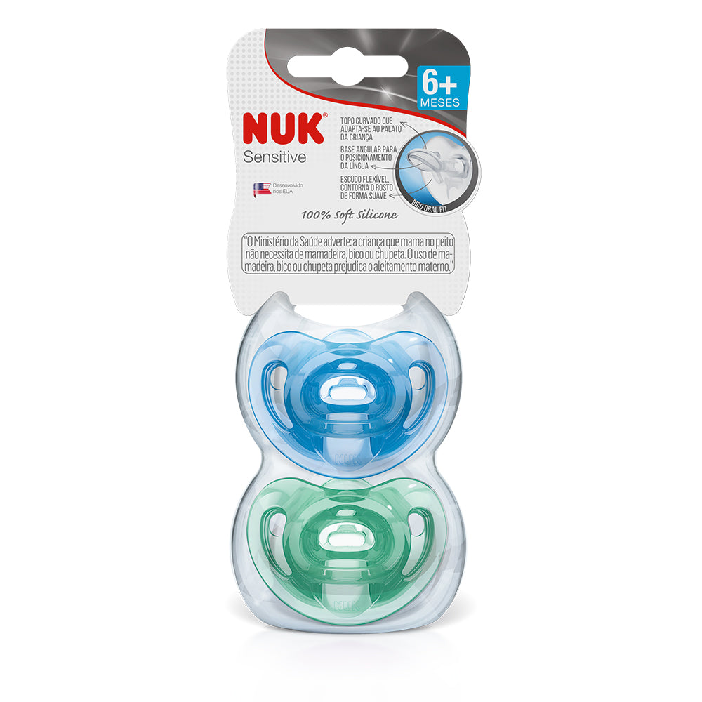As Chupetas NUK Sensitive com bico em formato anatômico foram desenvolvidas em 100% silicone soft flex extra macio, com design moderno em peça única, alça integrada para evitar perdas e cores agradáveis. Seu formato contorna o rosto do bebê de maneira suave sem cobrir o nariz do pequeno facilitando a respiração.
