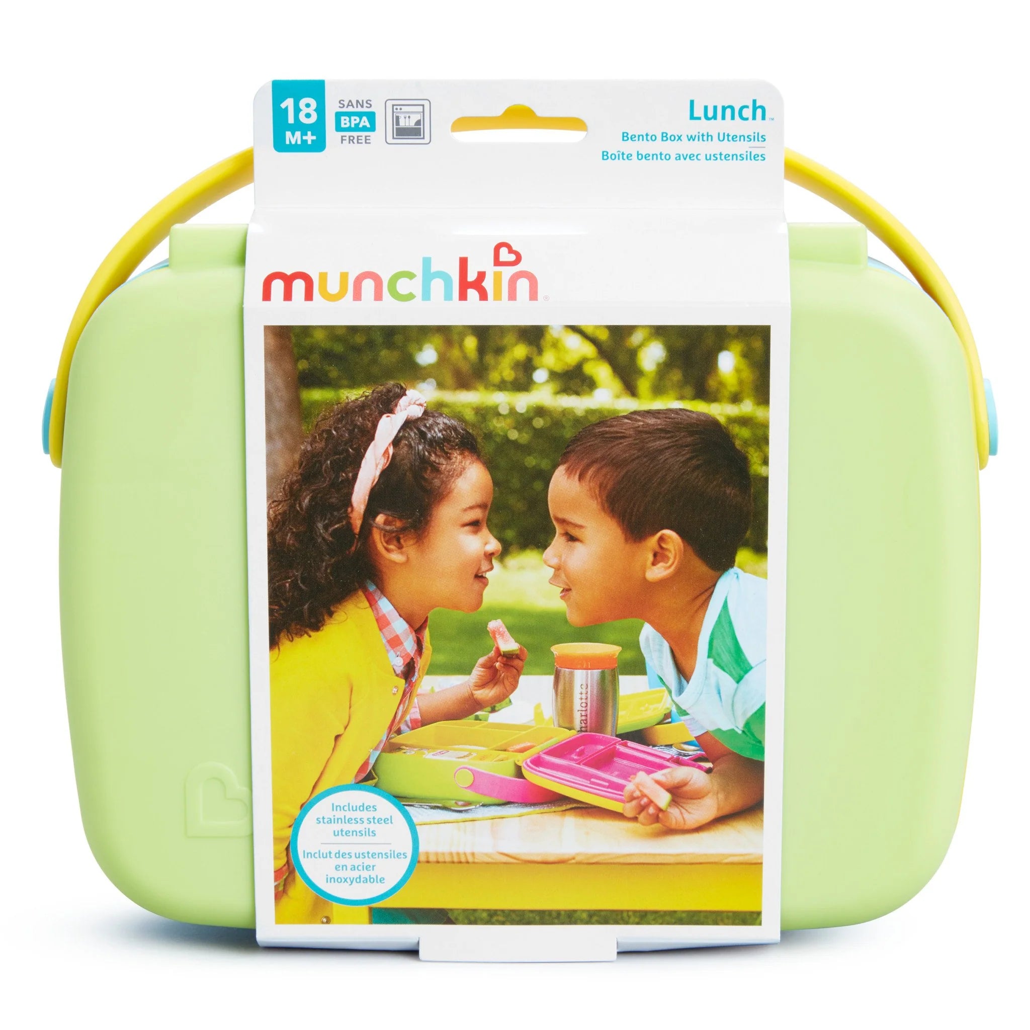 A Lancheira Bento Box da Munchkin vem com seu próprio conjunto de utensílios infantis de aço inoxidável que se encaixam diretamente na tampa.