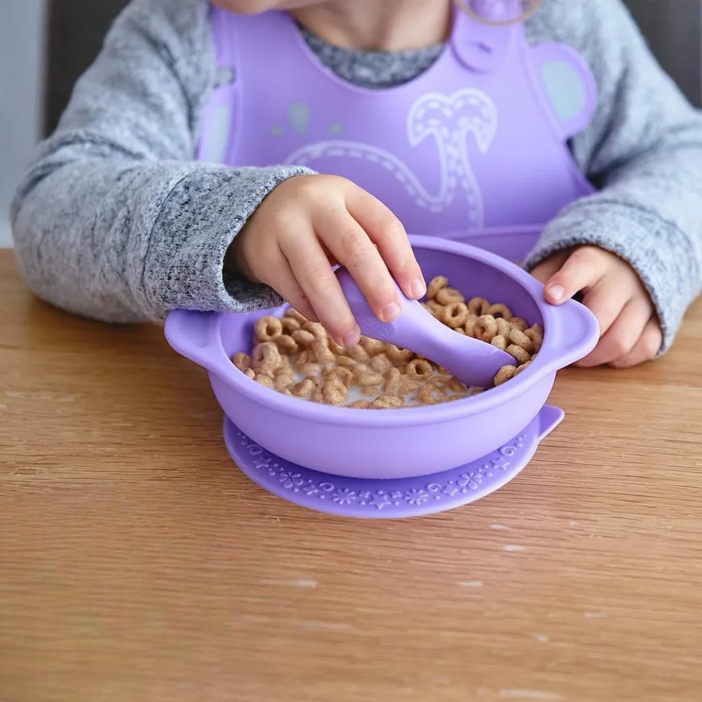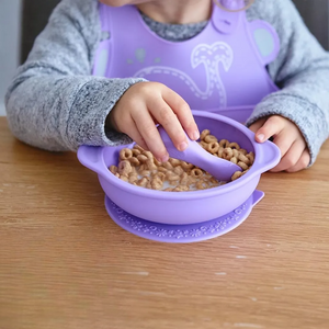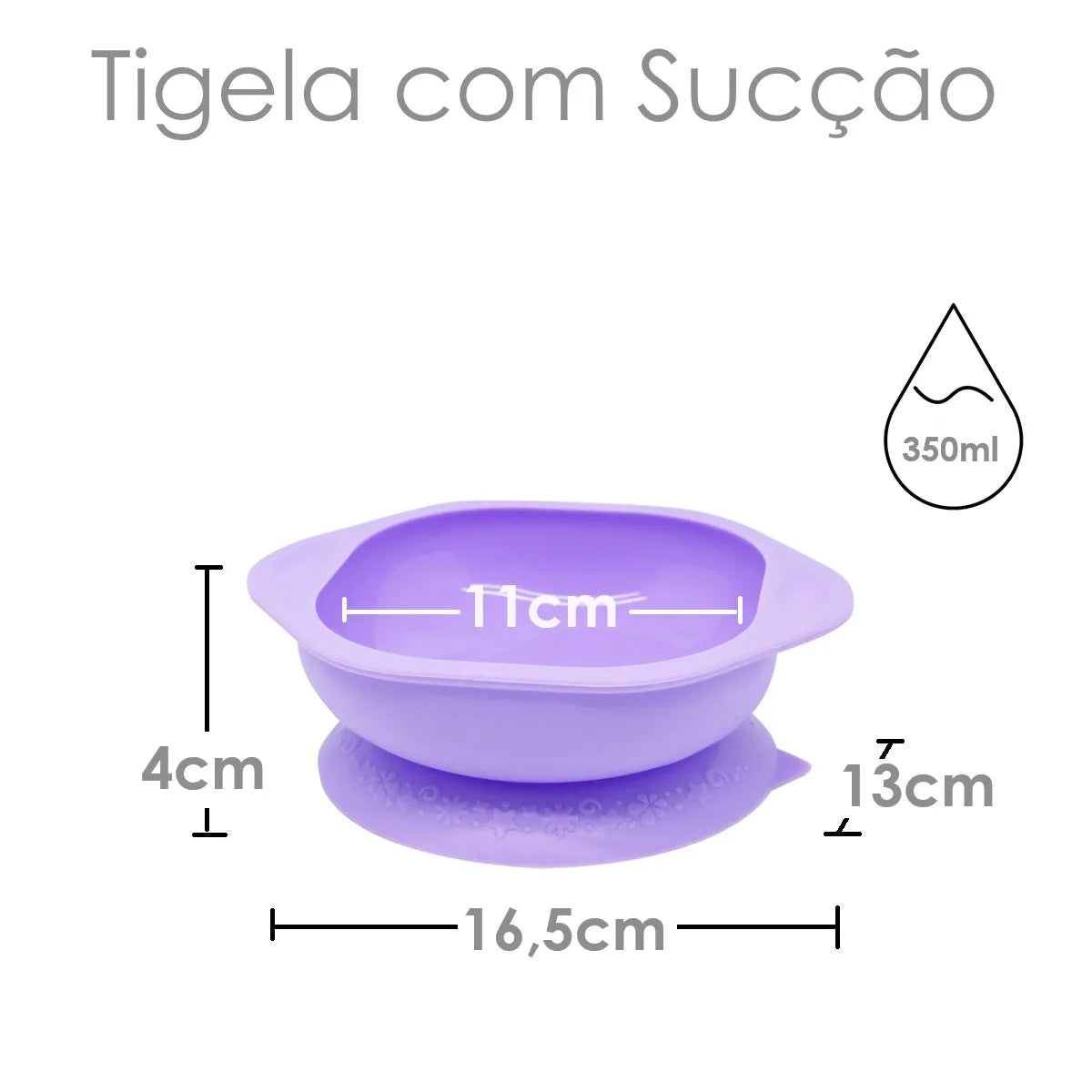 Tigela 100% em silicone, a base de sucção permite segurança à mesa para que seu bebê não consiga remover a tigela ou derramar o seu conteúdo, as guias de liberação facilitam a remoção da tigela pelos pais, pode ser levado ao micro-ondas e lava-louça, seu silicone é resistente, vai ao freezer e suporta o congelamento do alimento.